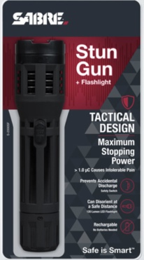 Sabre Stun Gun with Flash Light and Strobe Light. Tactical design with maximum stopping power.